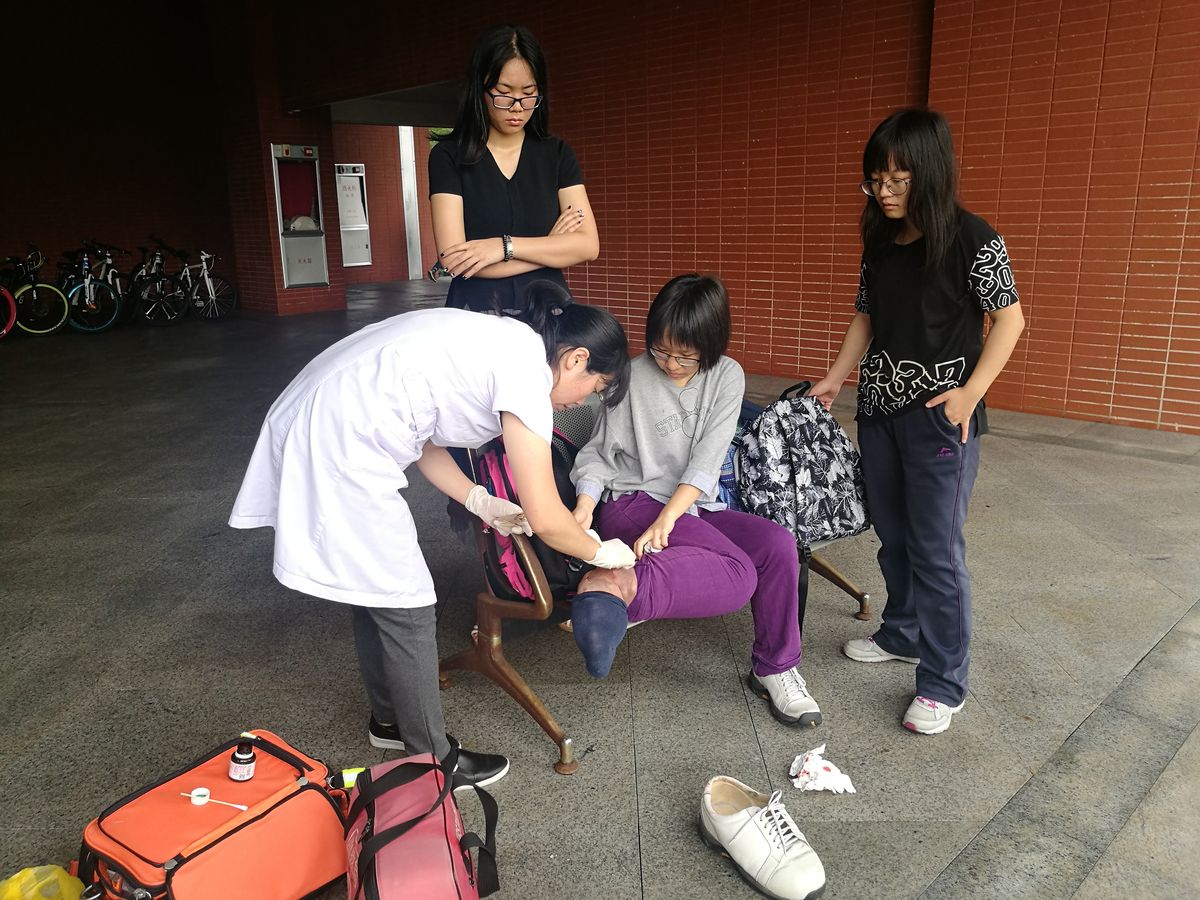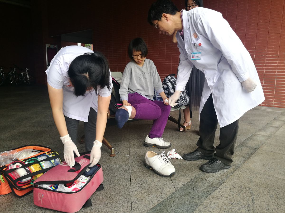 医务科人员正为患病同学处理伤口