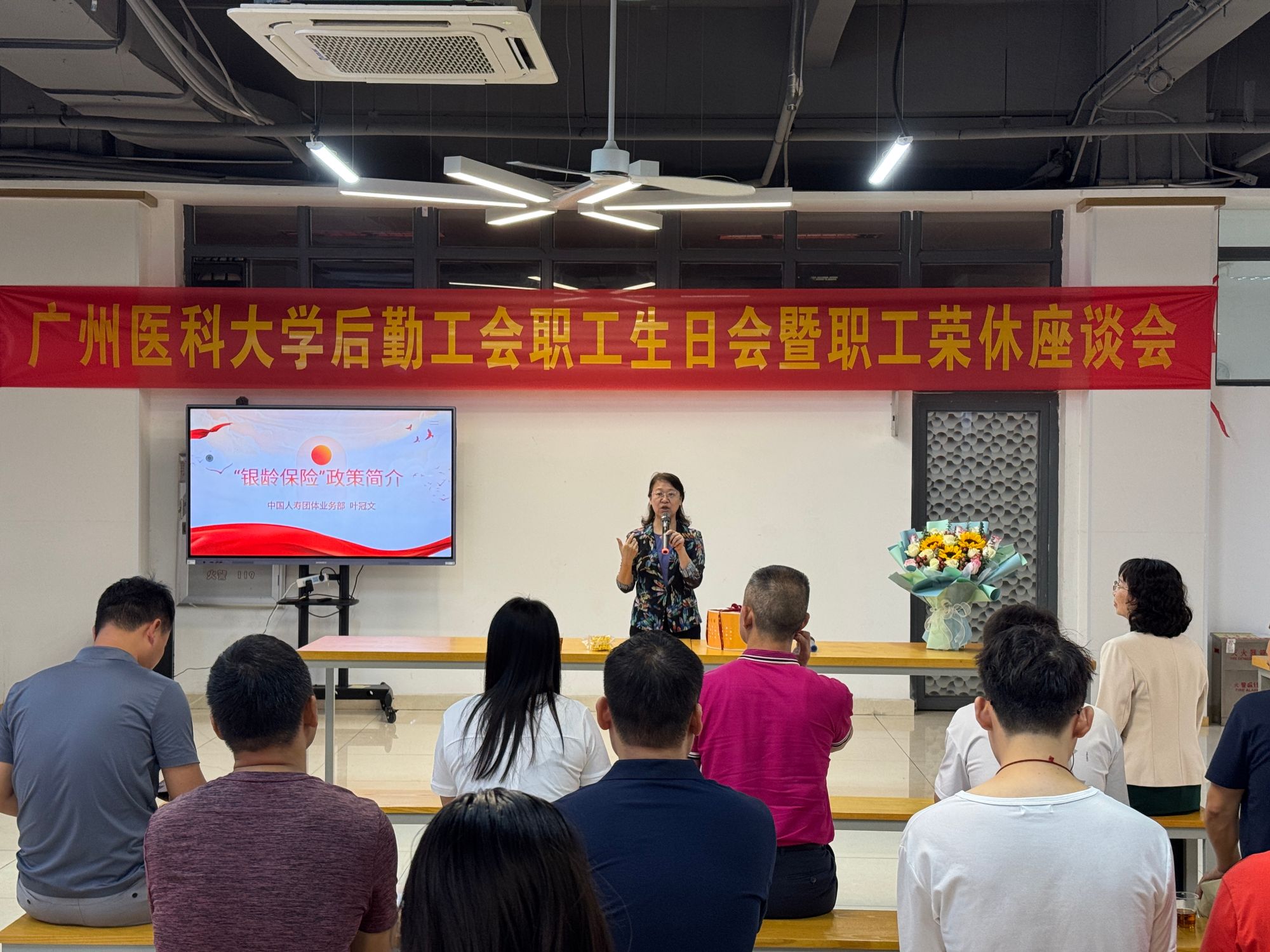 为深入贯彻落实组织关怀,切实增强职工的归属感与幸福感,3月31日上午,后勤工会在番禺校区食堂三楼举办2026年第一季度职工生日会暨荣休会。后勤及采购中心部门领导、职工代表与工会委员齐聚一堂,共叙情谊。活动由后勤党总支书记、后勤工会主席冯卫东主持,现场为本季度生日职工送上诚挚祝福,并为荣休职工举行温馨欢送仪式,充分体现了组织对职工的关心与重视。